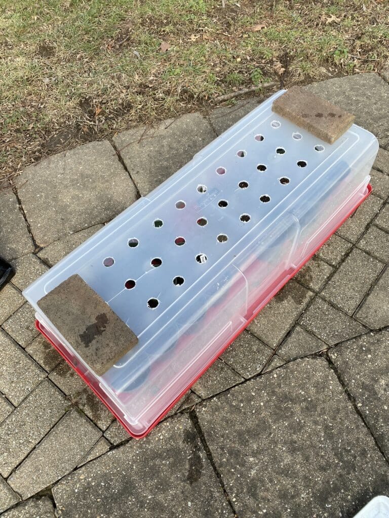 I rounded up a few miscellaneous bricks, which I used to make sure the bottom was heavy enough not to be bothered by wind or animals, and then I added a few bricks to the top for the same reason.